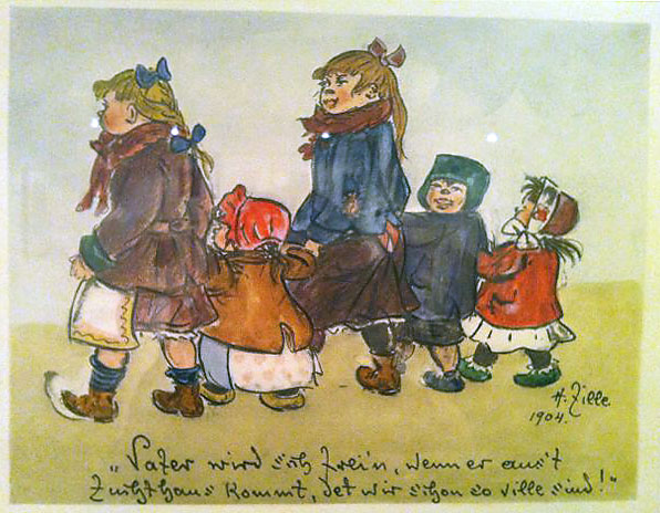 A cartoon by Heinrich Zille. This cartoon’s punchline is: “Vater wird sich frei’n, wenn er aus’t Zuchthaus kommt, det wir schon so ville sind!” (Dad will be thrilled when he gets out of jail and sees how many we are already!)